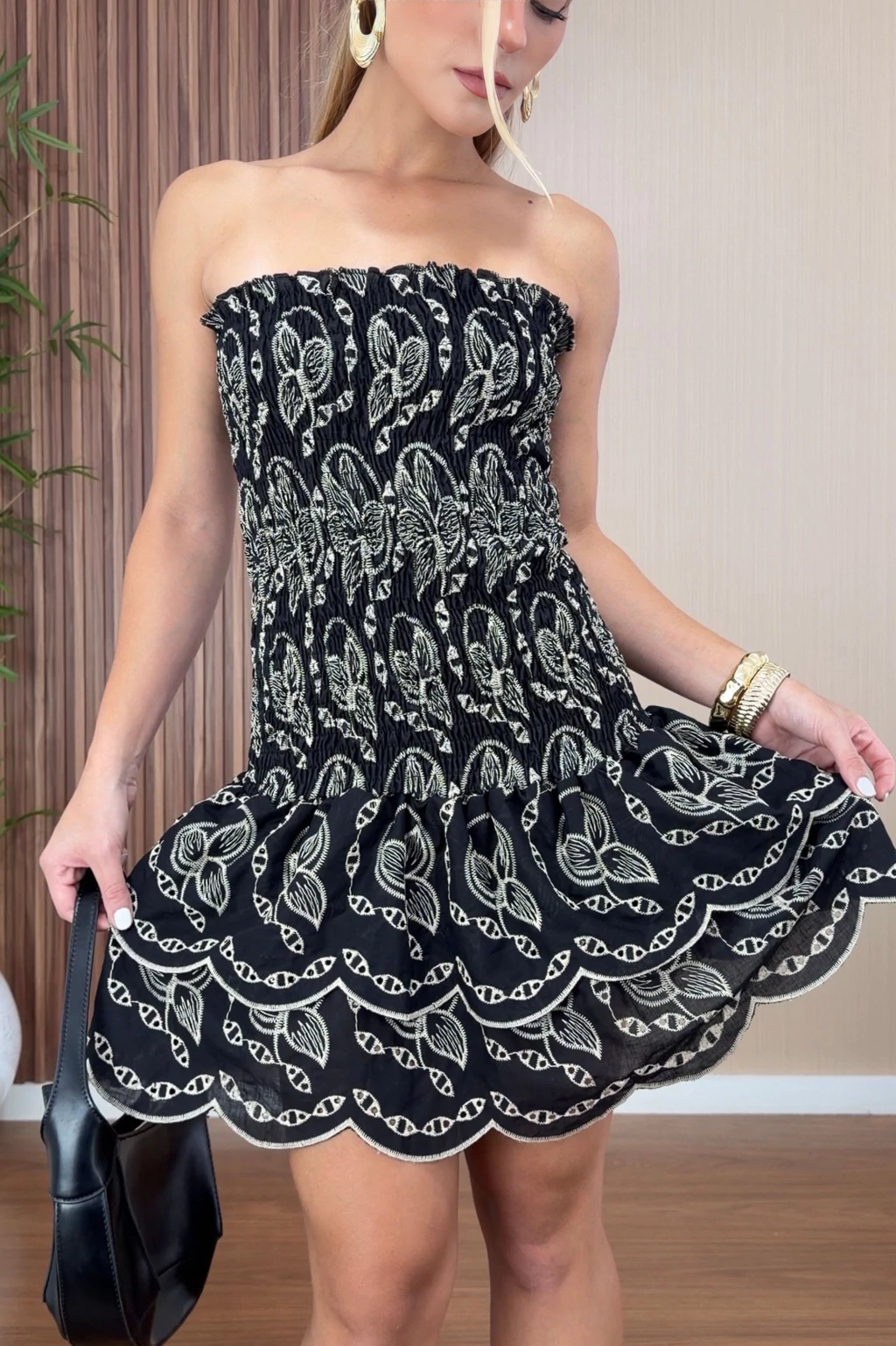 Vestido feminino confeccionado em tecido leve e confortável, com busto reto e corpo todo em lastex, garantindo excelente ajuste ao corpo e valorizando a silhueta. A saia possui camadas delicadas com acabamento bordado, trazendo um visual romântico e feminino à peça.